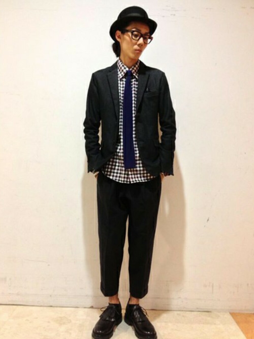 一見フランネルの様な起毛素材に見える、ジョグデニムジャケット+大柄チェックのネルシャツに、現代風なネオンカラーのニットタイを合わせてみました。足元もボリュームのあるシューズを合わせてトレンドを盛り込みました。