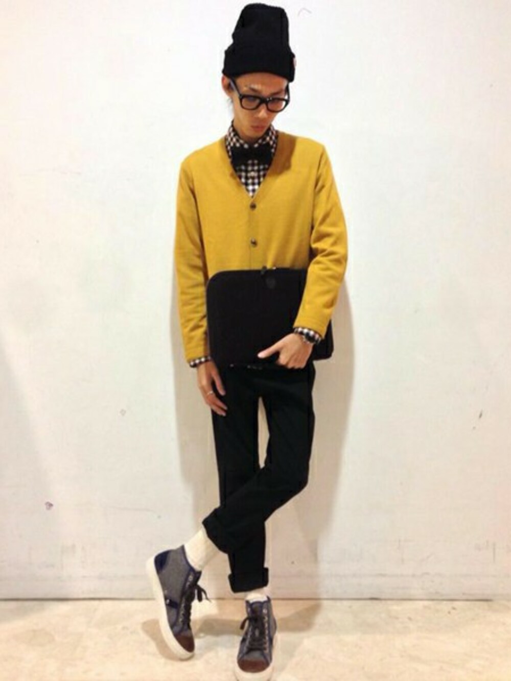 チェックシャツとカーディガンを使った、一見カジュアルなスタイリングに、クラッチバッグとボウタイをハリスツイードで統一!ニットキャップとパンツを黒で統一し、引き締めた部分もポイントです!