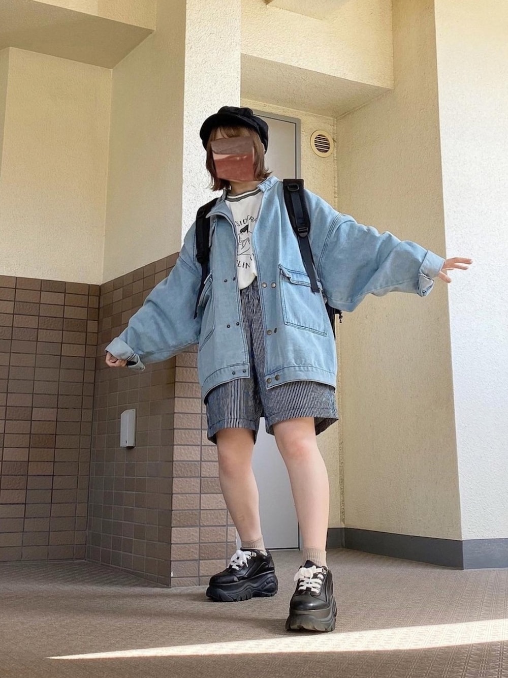 るる 🥦低身長コーデ🥬のデニムジャケット「【neos -addictive design-】ビッグシルエット ノーカラー ドルマン デニムジャケット」を使ったコーディネート