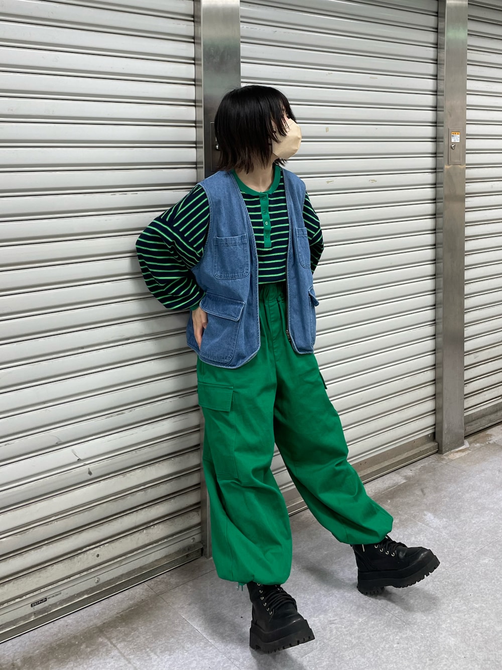 グリーンのワントーンにデニムの差し色サッ🟩💙 ブーツと合わせてブラックのバッグとかベストでもいいかも( -᷅_-᷄ )