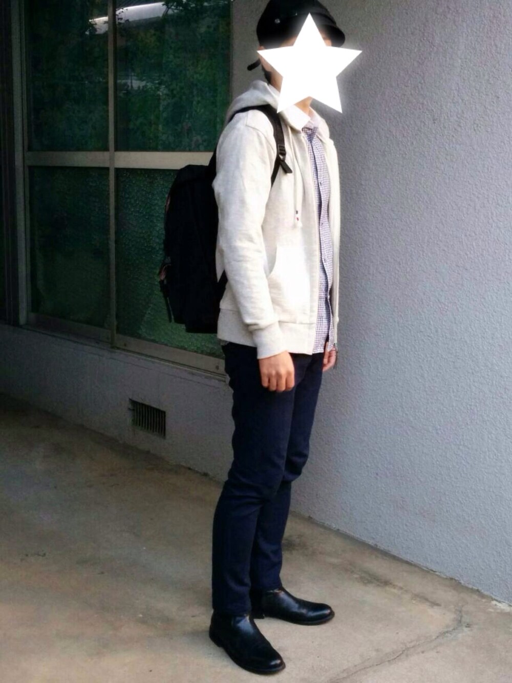 チェックシャツに王道のグレーパーカーにタイトなスラックスとブーツでドレスアップさせたキレイ目カジュアルコーデ⭐︎ パンツをジーパンではなく、タイトなスラックスと、スニーカーではなく、ブーツを合わせたところがポイントです(^^)