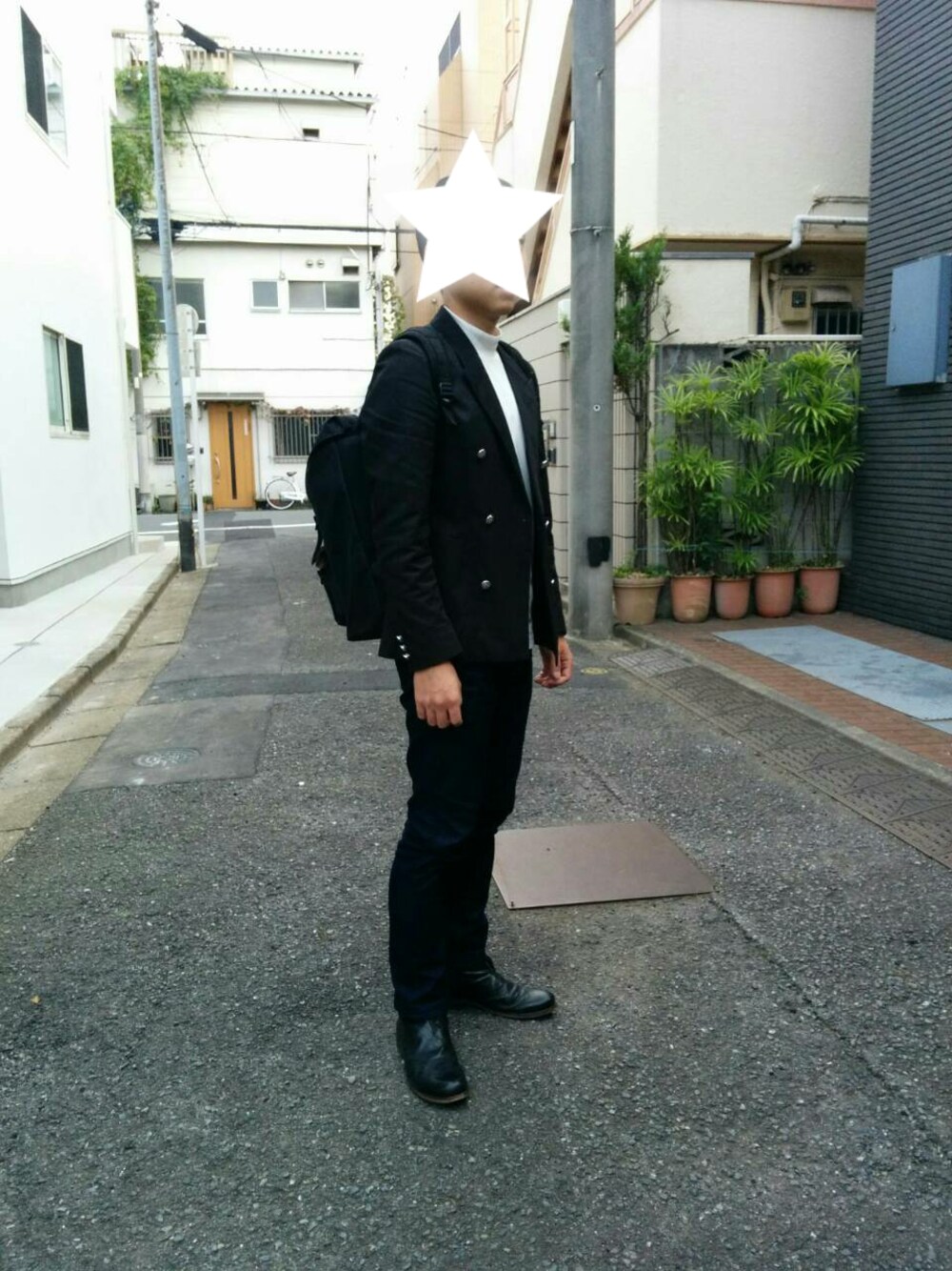 上下黒っぽいですが、パンツは紺のユニクロジーンズです! ダブルのジャケットを久しぶりに着ましたー🌠 ちょっとハイネックTが上品な感じなので、バックパックとジーンズでカジュアルに😁