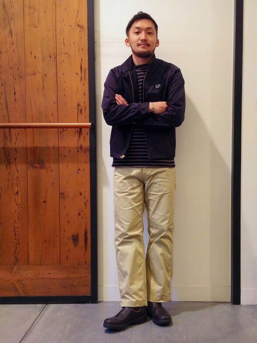 太めのチノパンにジャストサイズのトップス、アウターでバランス良く。 悪天候の日はブランドストーンが大活躍です。