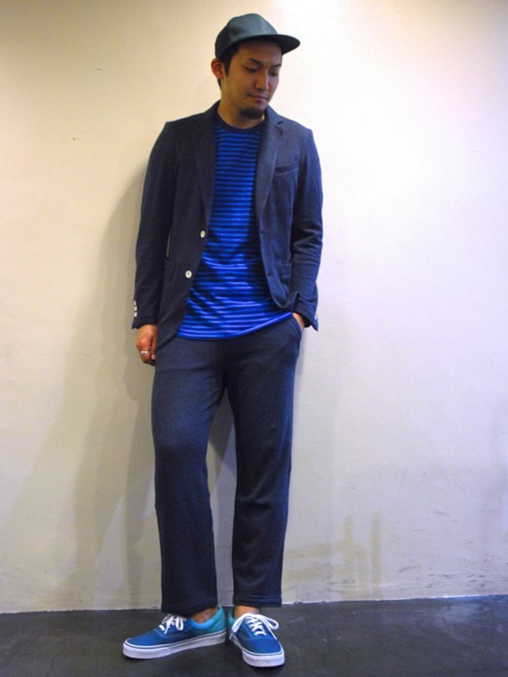 フィルメランジエのボーダーTeeに、爽やかなバイカラーの色味のVANSを合わせた春コーデです。 キャップはKIJIMA TAKAYUKI。 セットアップで全体をまとめました。