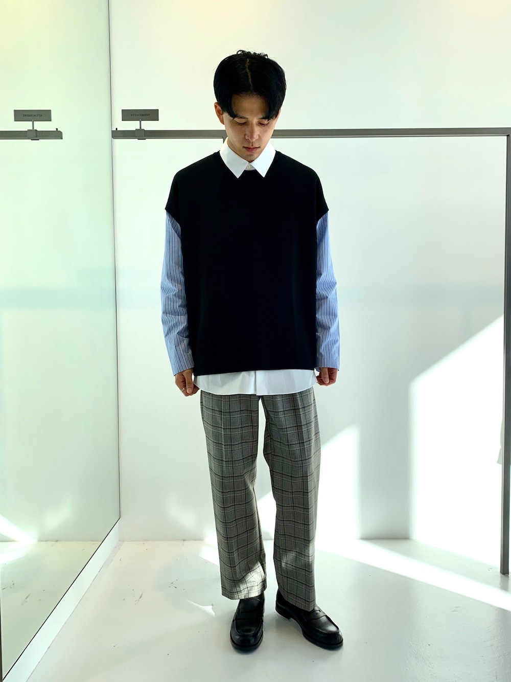袖切替は一枚でも主役級。 白シャツでレイヤーし区切り付け。 ストライプとチェックを程よく取り入れ、 ゆるめのシルエットで遊びを効かせたスタイル。