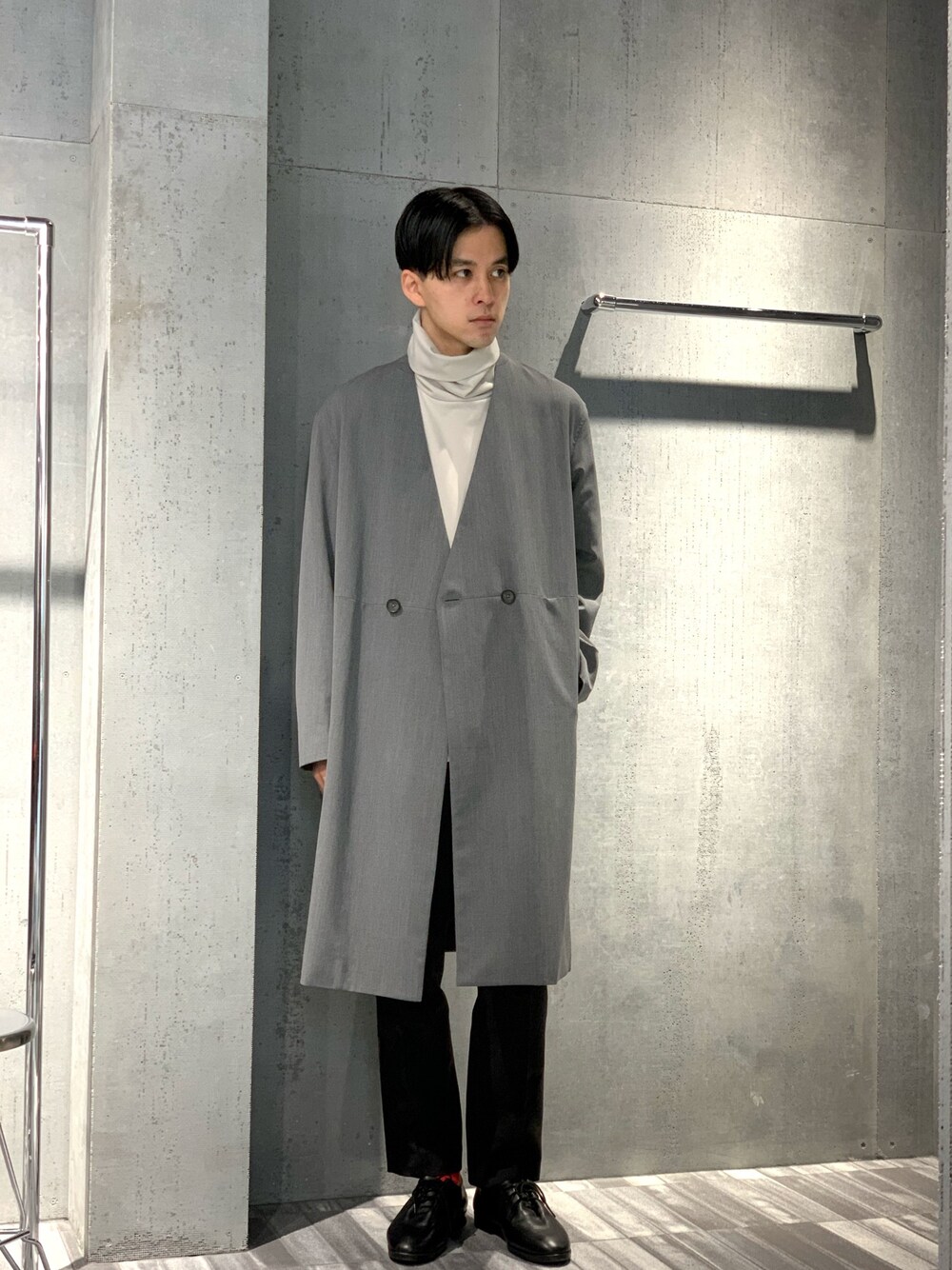 ノーカラーでミニマルに。 と見せかけてダブルブレストで一味足した。 そんなコートの真価は、実はこの上からアウターを着た先にある。