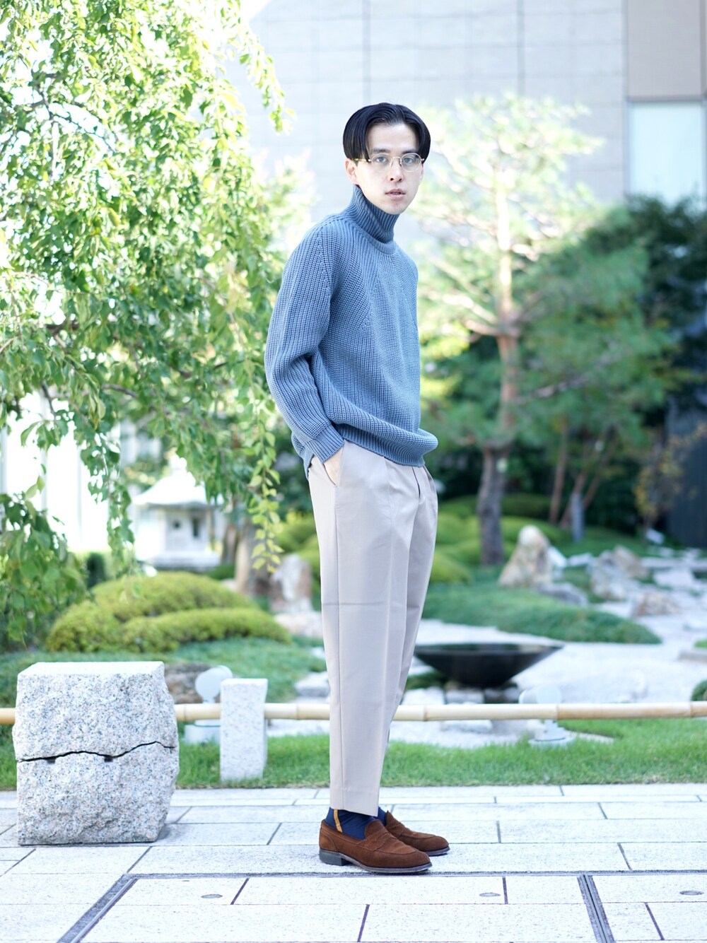 BATONERニット。 タートルもオススメ。 ブルーグレーは繊細な秋の装い。