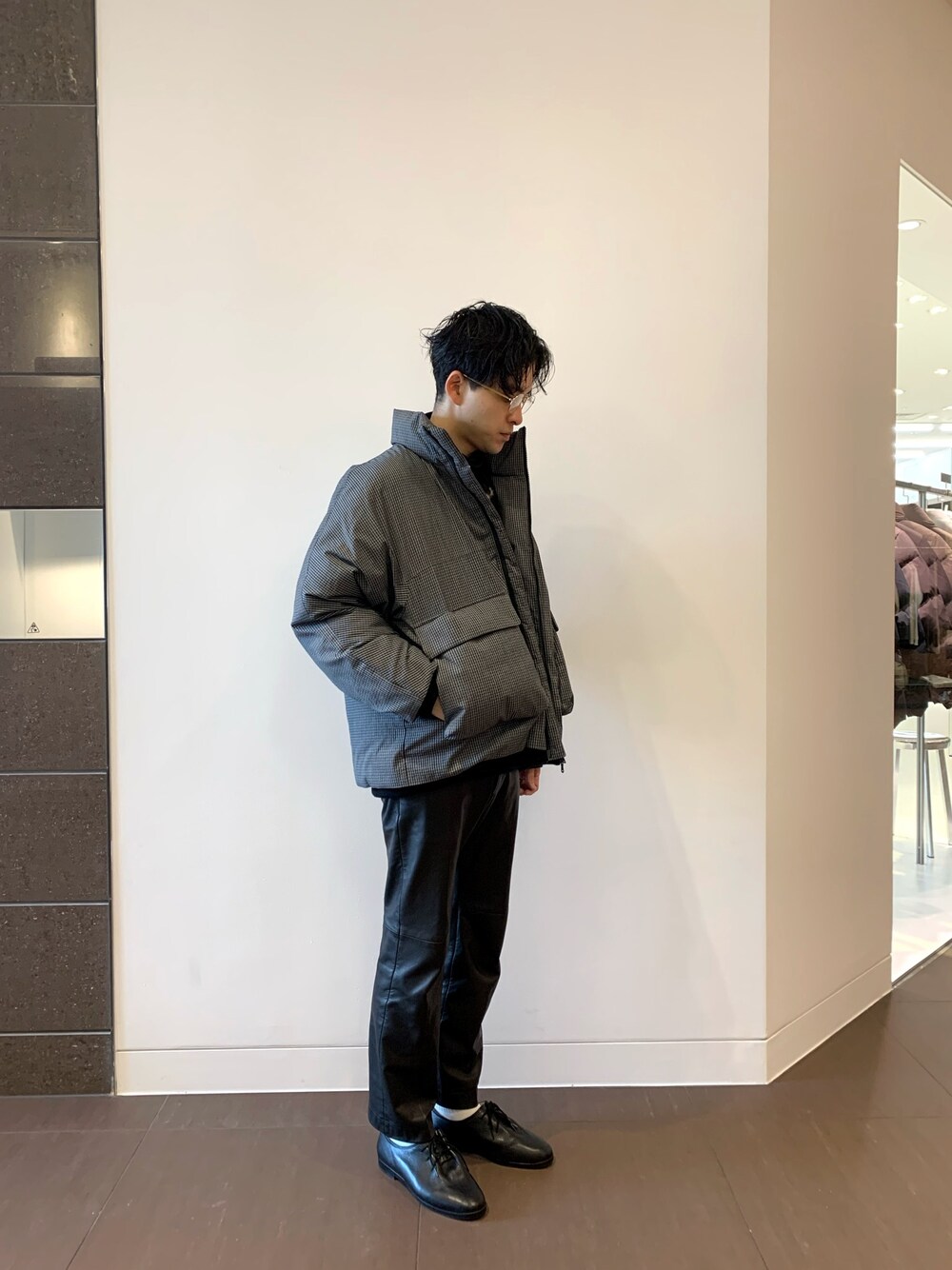 スタンドカラーのオーバーシルエットダウンは細身のパンツと合わせてこなれシルエット。 レザーパンツなら更に今年らしい面構え。