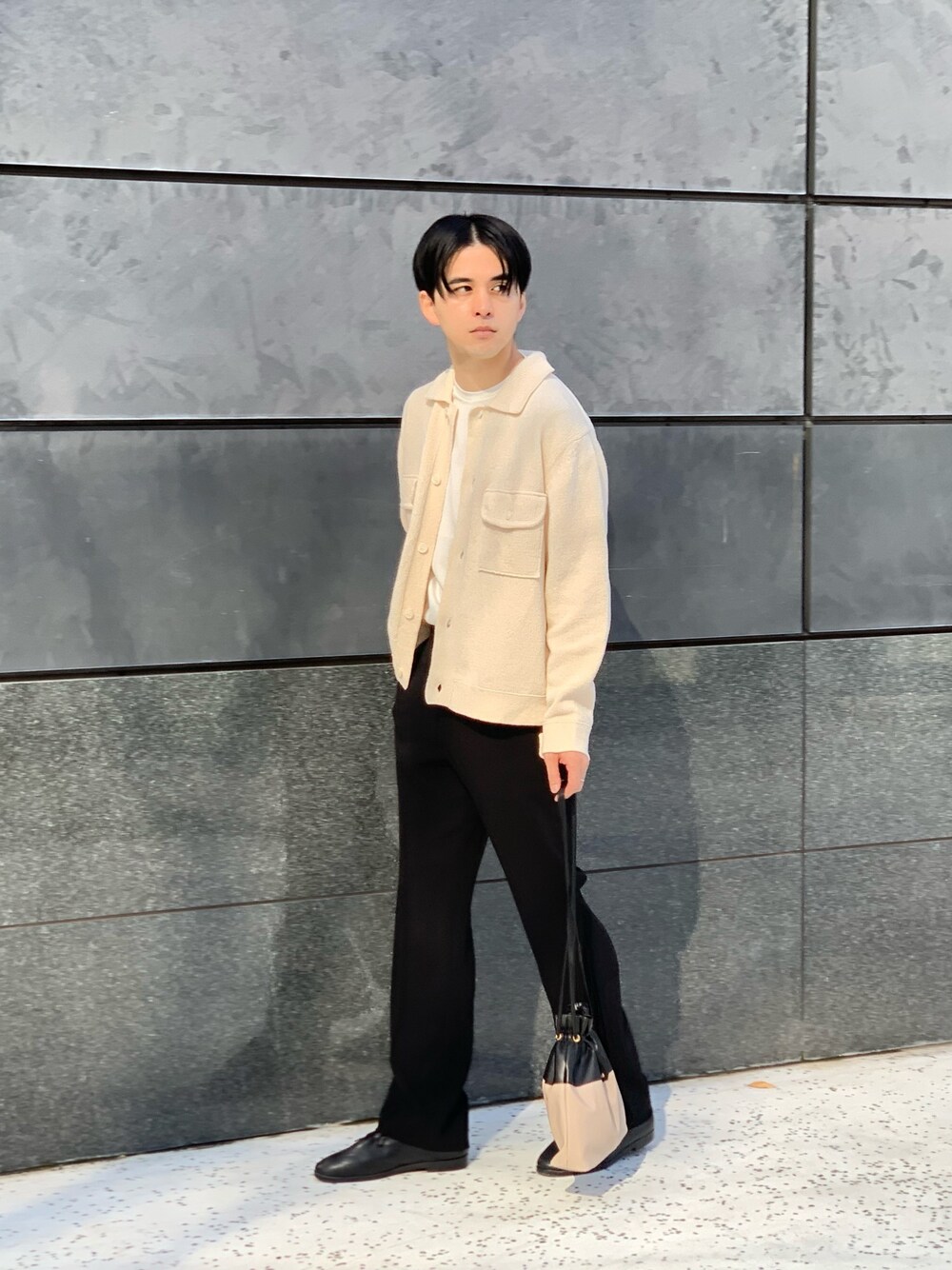 カーディガンだけど、クロップブルゾンぽくもある。 コーデュロイに近い触感も肌に優しいニットカーディガン。 エクリュカラーのモノトーンコーデ。