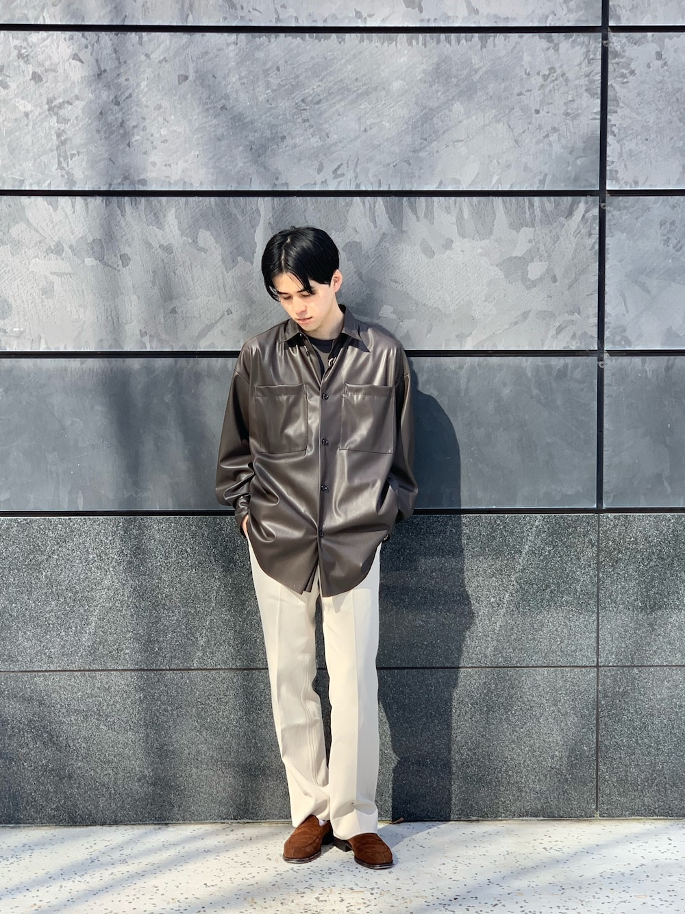 オーバーシルエットだけど、 細身の自分が丁度よく緩くキレイに着たい。 それが実現する。 そんなフェイクレザーオーバーシャツ。
