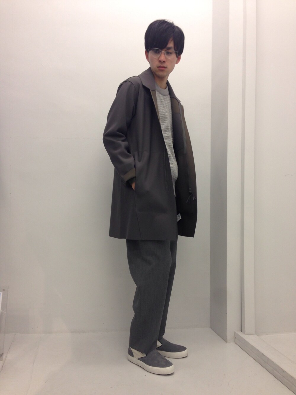 緩めのステンカラーに緩めのスラックス。 色はグレーのワントーン。 コートに関しては、袖に配置されたリブがカーキ色ときた日には… 少し大人なシルエット。 シルエットと素材で春を感じる。 無理に派手な色を入れなくていいんだよ? そんなささやきが聞こえました。 こんな春は如何でしょう?