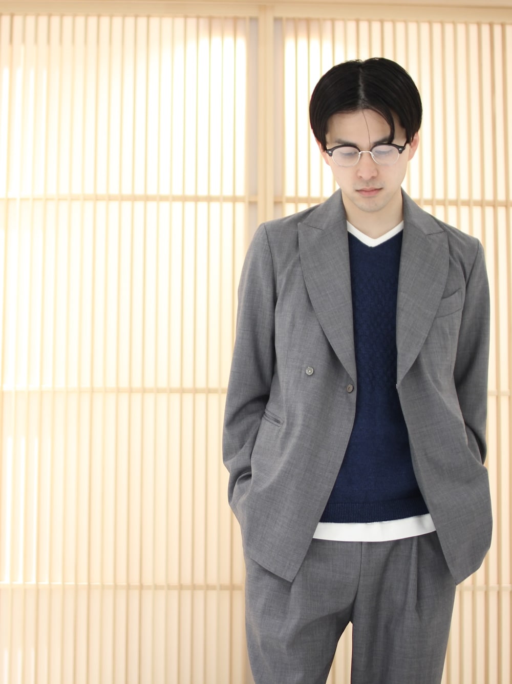 セットアップが好きだった。 さらっと着れるが、格好もつく。 昔から好きで、気付けばセットアップの山。 少し飽きていた自分がいた。 もういいか、 そんな言葉とは裏腹に、 着てみたセットアップは、 これまでにない緩めのシルエット。 更にフロントはセミダブル、 ディテールに小振りなスナップボタン、 残ったのは、 カッコいいセットアップを着た井の中の蛙。 ただそれだけだった。