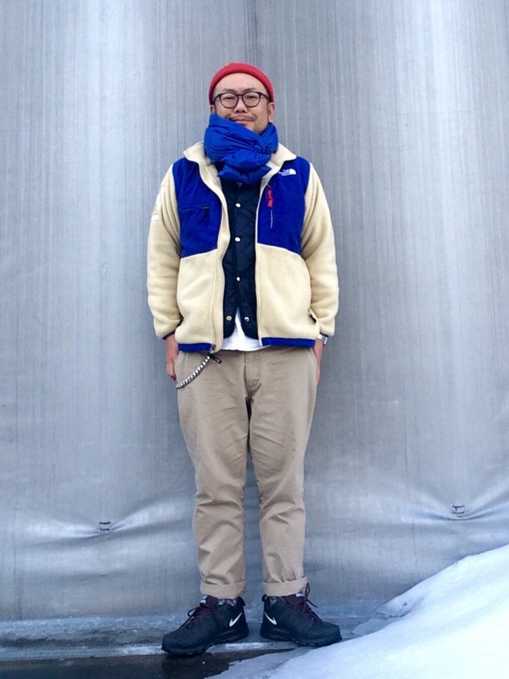 ベージュ系のチノパンツを着用したメンズの冬コーディネートの1枚目の写真