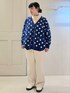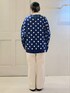 ドット柄が印象的なカーディガンにフレヤーシルエットのパンツを合わせました。 カーディガンのブルーの色が映えるように他のアイテムは白で統一してます。 ロンTはバックプリントもポイントです。