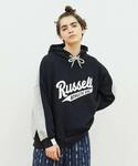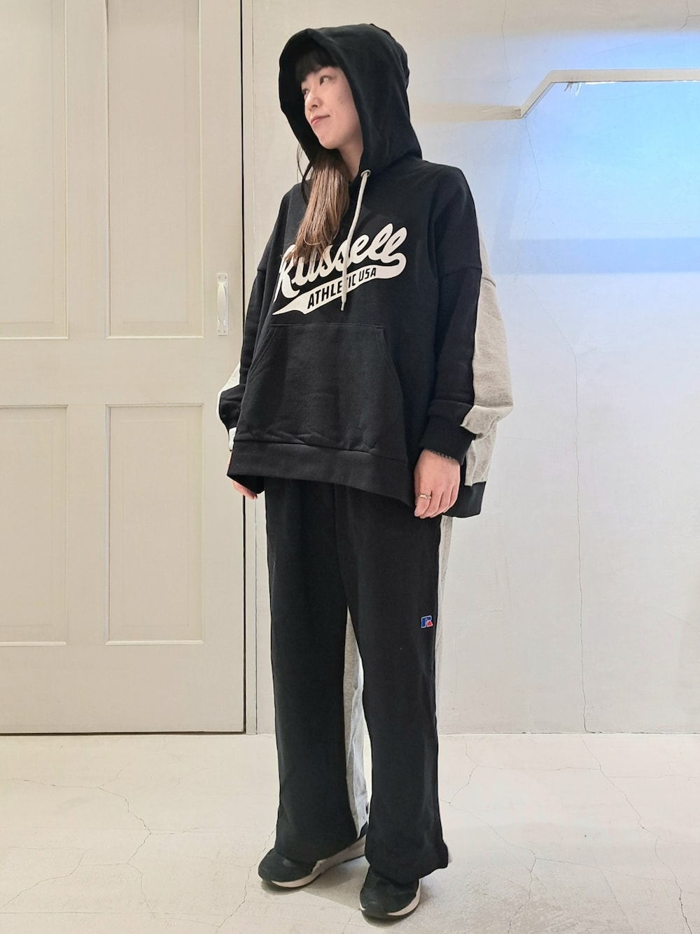 1/27(金)~WEB、店頭での予約受付中! 「RUSSELL」コラボアイテムをセットアップで着てみました。 パーカーもパンツもゆったりで着やすくおすすめです。 着心地をぜひお試し下さい。