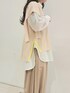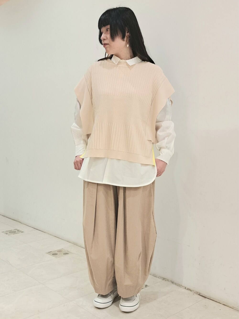 春らしい明るい色のワントーンコーディネートにしてみました。 全体的にシンプルですが、ベストの黄色いアクセントがフラボアらしくおすすめのポイントです。