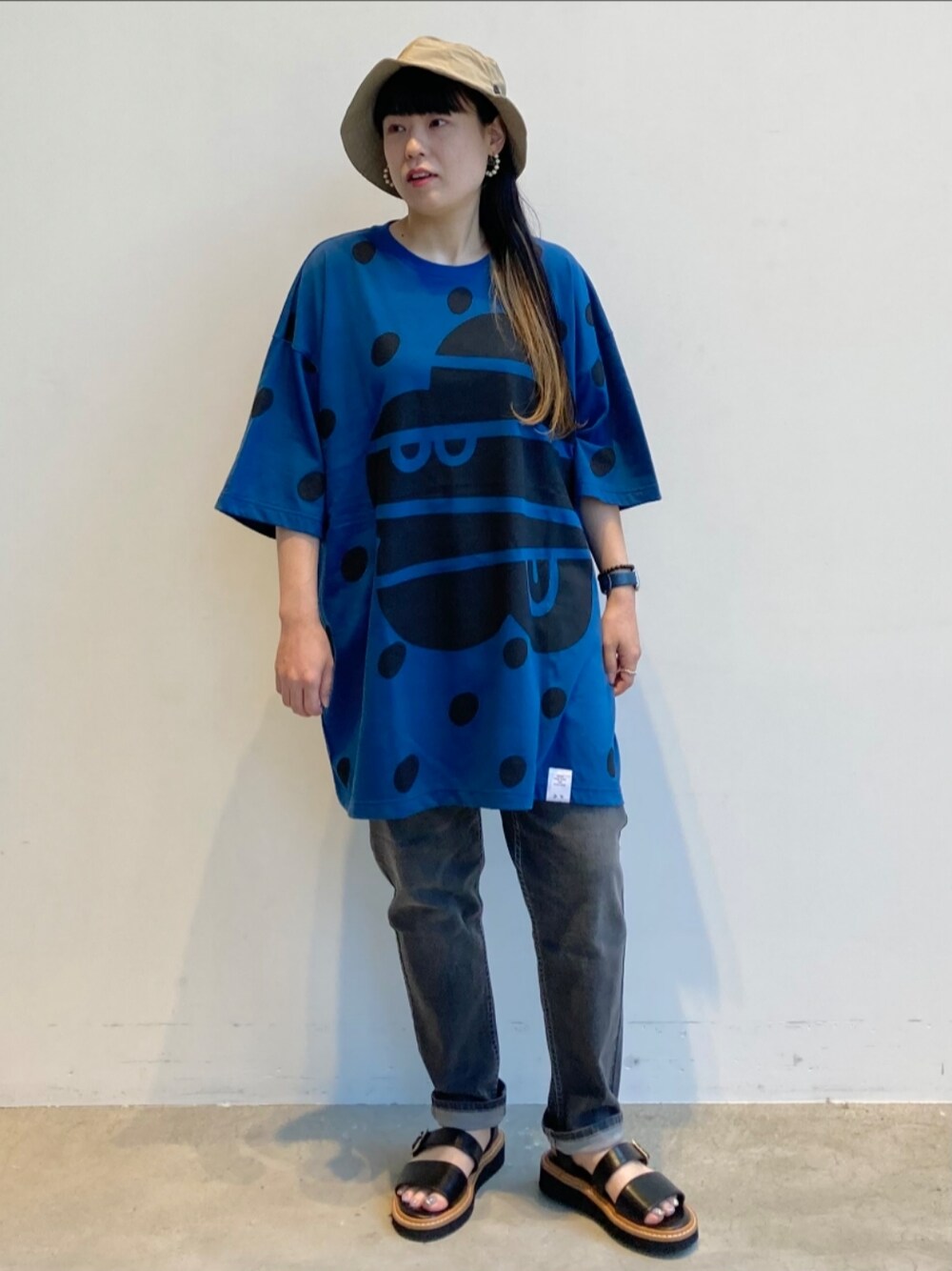 落ち着いたブルーのビッグTシャツを使ったコーディネート。 FRAPBOIS PARKの新アンバサダー「パーキー」の大きなプリントとドット柄が目を引くアイテムです。 細身のデニムと合わせたジェンダーレスなコーディネートなので、男性にもオススメです。 ベージュのバケットハットを被って、カジュアルな夏のお出かけスタイルになりました。