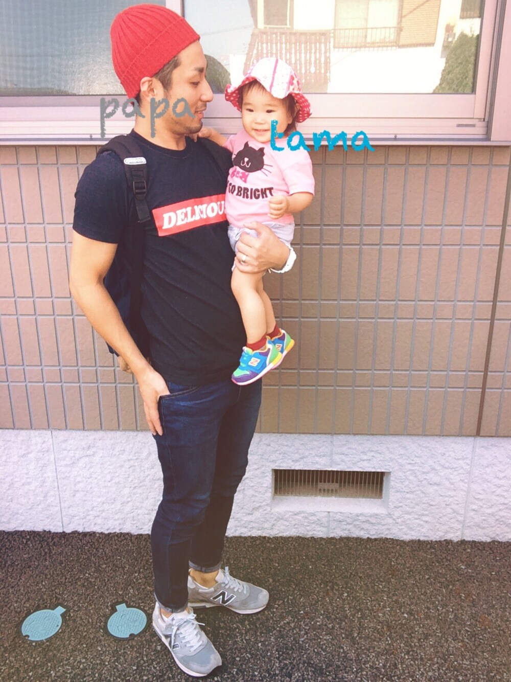今日は家族で公園スタイル。 親子でポイント色合わせ。赤、グレー ニューバランス、パパは1400 娘は996
