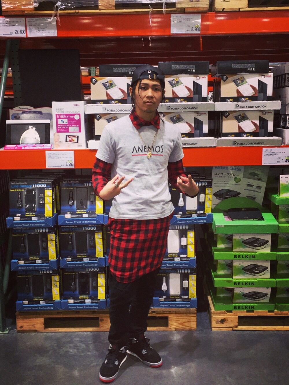 実はチェックのシャツを2枚使ってます。 一枚は普通に着て、もう一枚は腰に巻いてます。