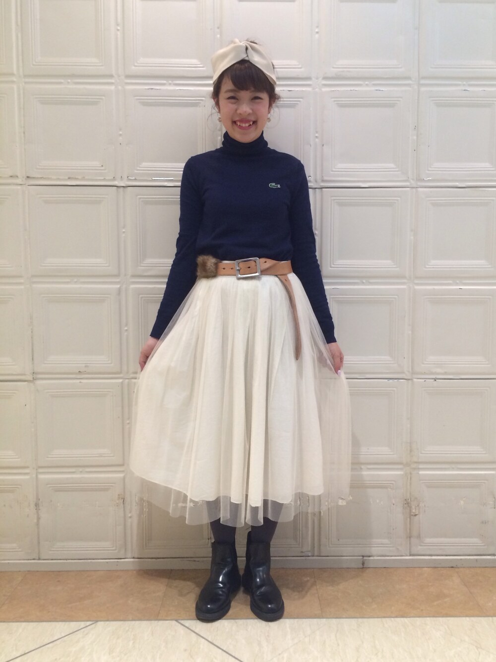 ラコステのタートルを主役にしたくて、ヘアバンドとスカートの色味を白で抑えました🐊✨ フェイクファーのベルトは動物愛護をアピールしてます🙋