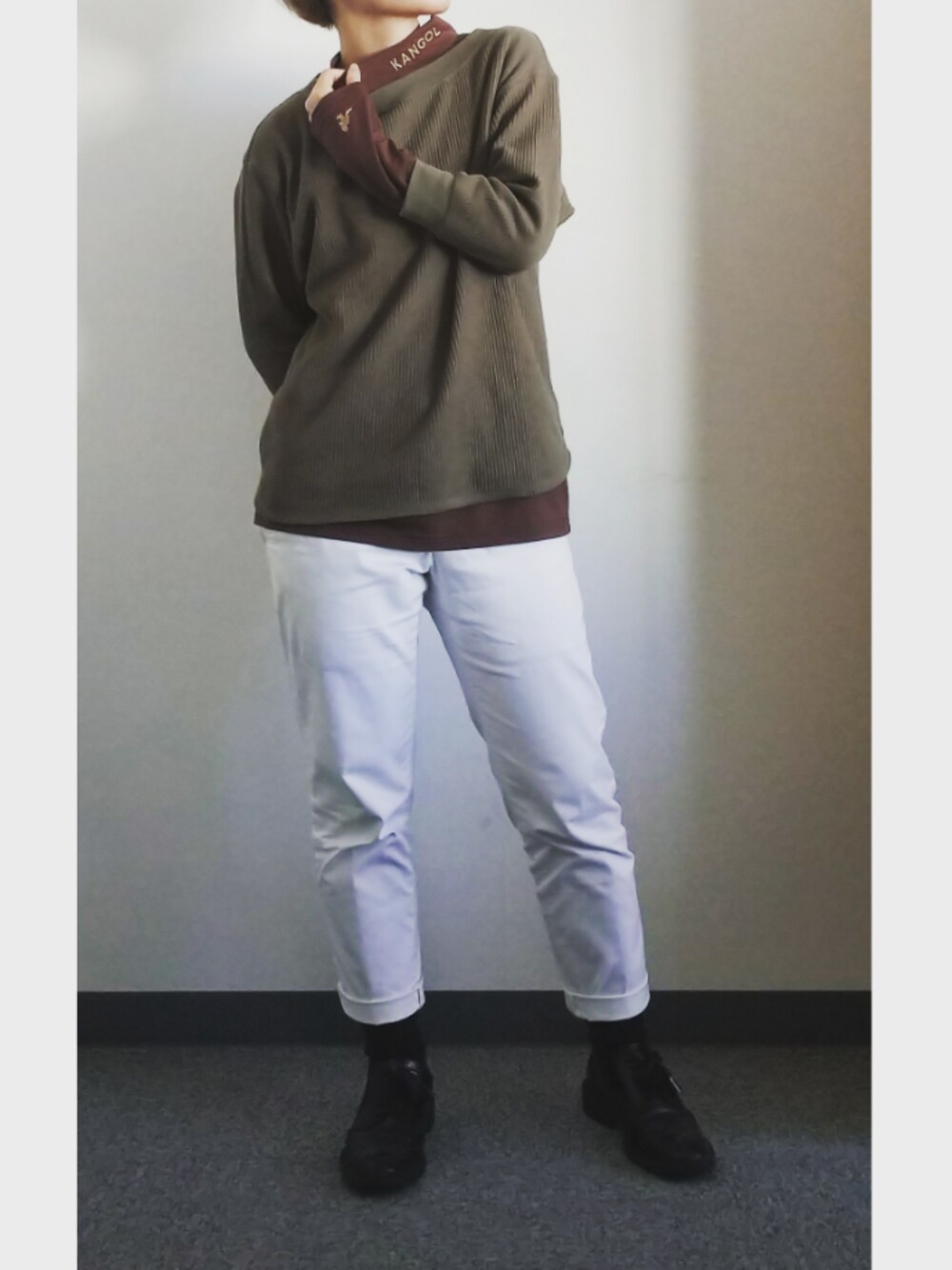 このワッフルスウェット、袖の長さと、襟ぐりの広さと、裾の丸いカットが、このロンTと組み合わせる上で最高だな、と思う。