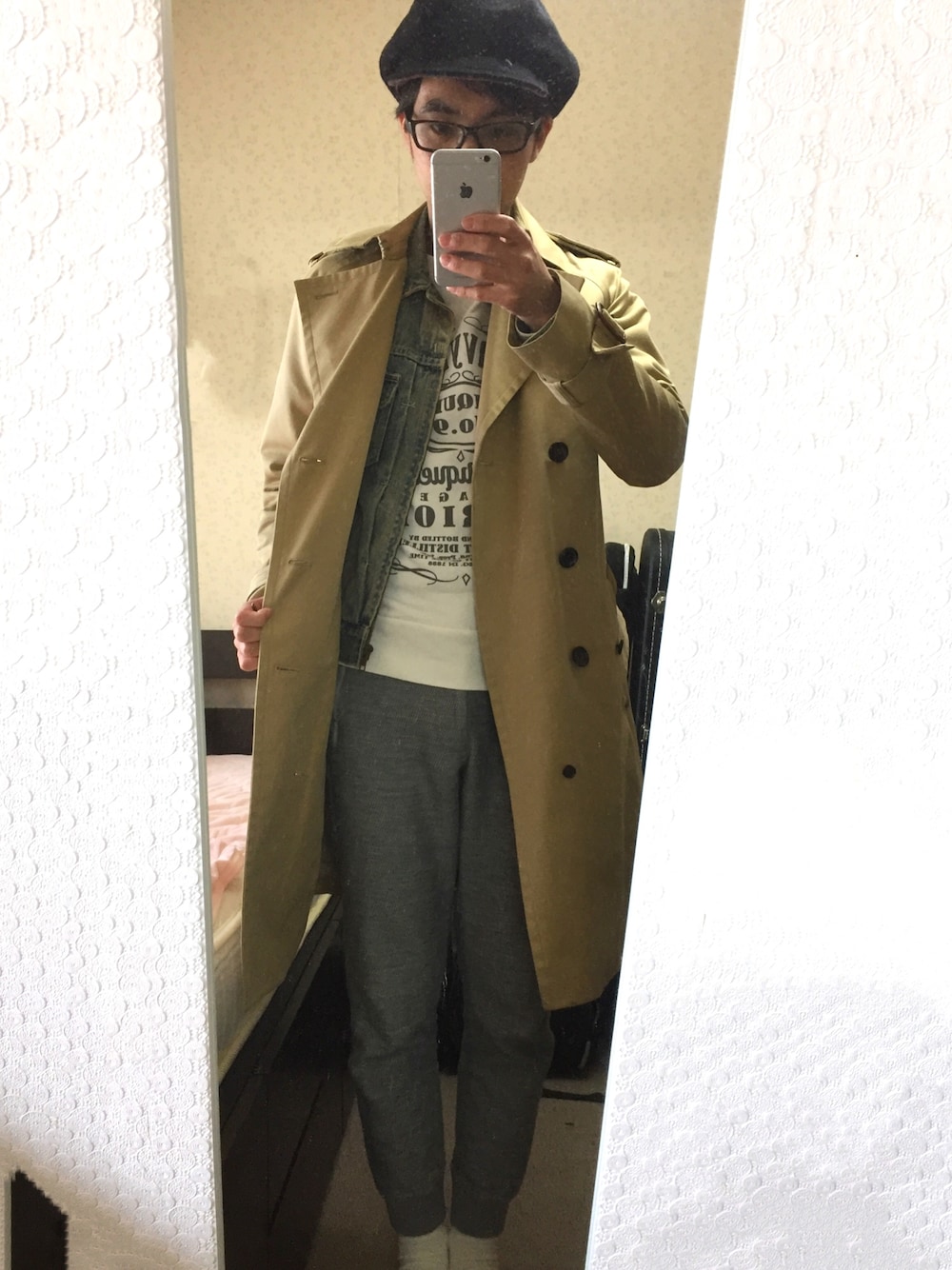 トレンチコートにGジャンは定番ですね。