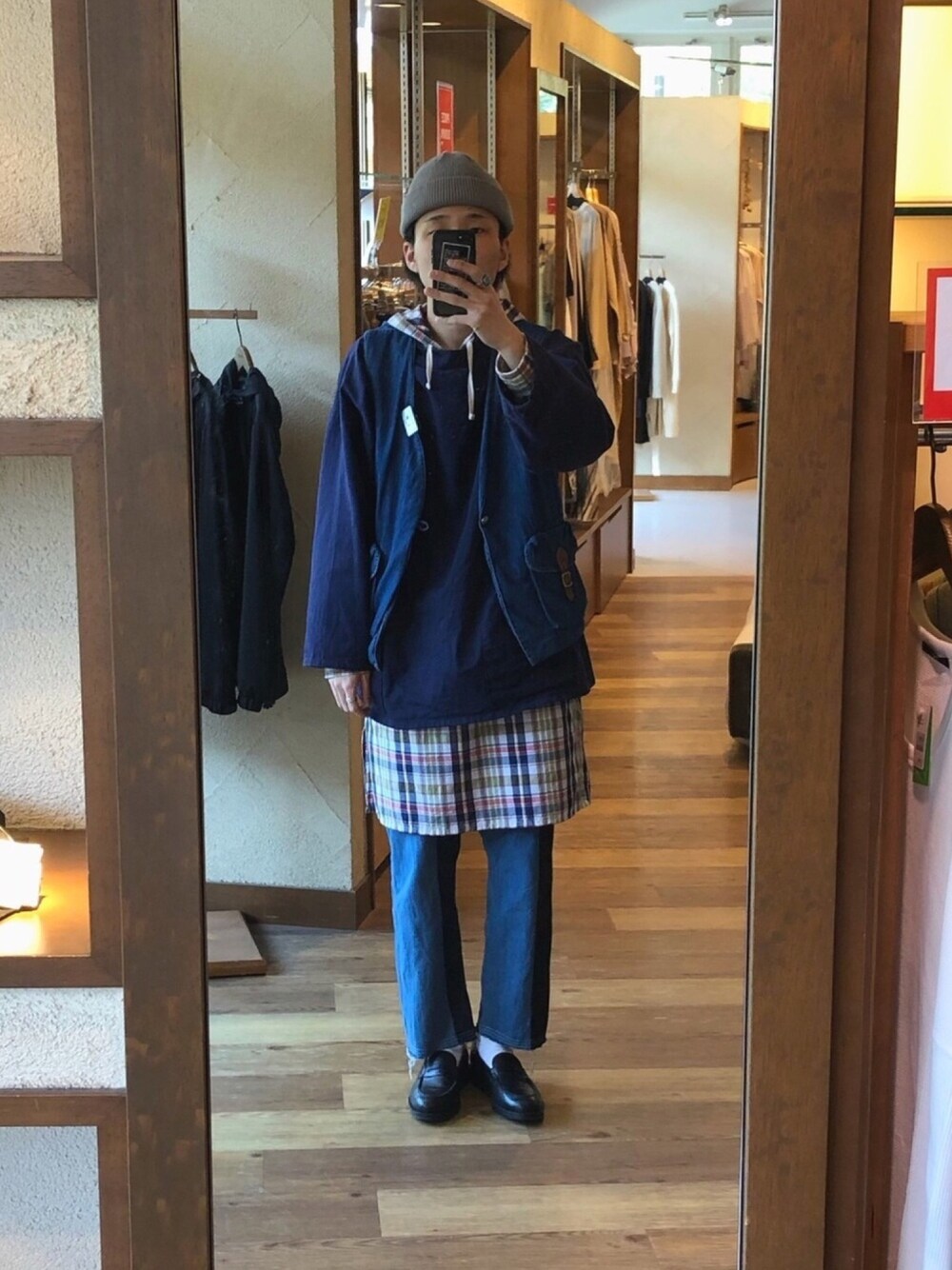 デザインが好みでリリースのたびに買い足してしまうクレイジーパンツをメインに全体的にブルーで合わせました🕺🏻 ベストやスモッグシャツのワーク、ミリタリー系で固めると無骨な雰囲気になってしまうので、ニットキャップやファッション性の高いパンツでストリートに馴染むよう意識しました。