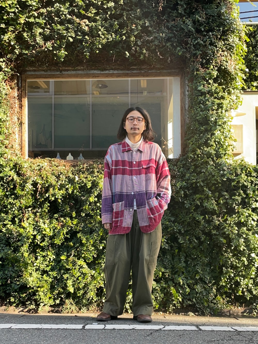 起毛した素材のチェックカバーオールをお気に入りのミリタリーパンツと。 変化球的なワーク×ミリタリー。