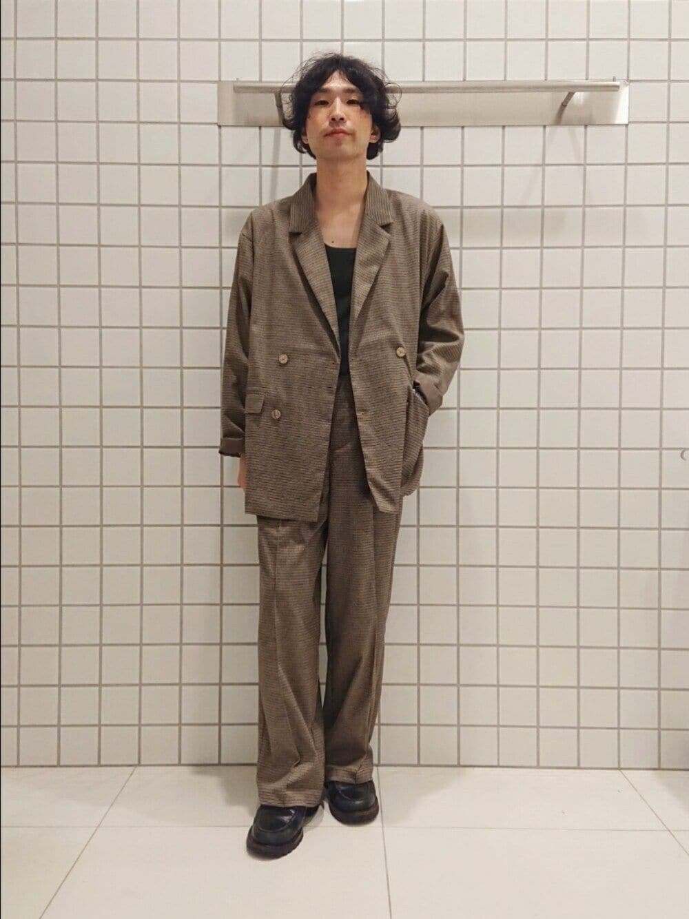 ルーズジャケットのセットアップ トップス、ボトムス共に緩くカッコよく着れて、ジャケットはロールアップして着崩しても可愛いです○