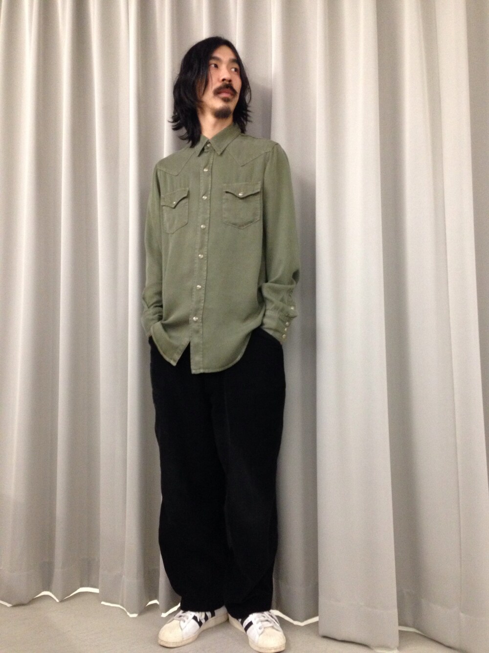 adidasのスーパースターのボリュームにワイドパンツでゆとりのあるスタイリングに サンローランのカーキのシャツは生地もシルエットも最高! tops...SAINT LAURENT PARIS pants...ラルフローレン shoes...adidas