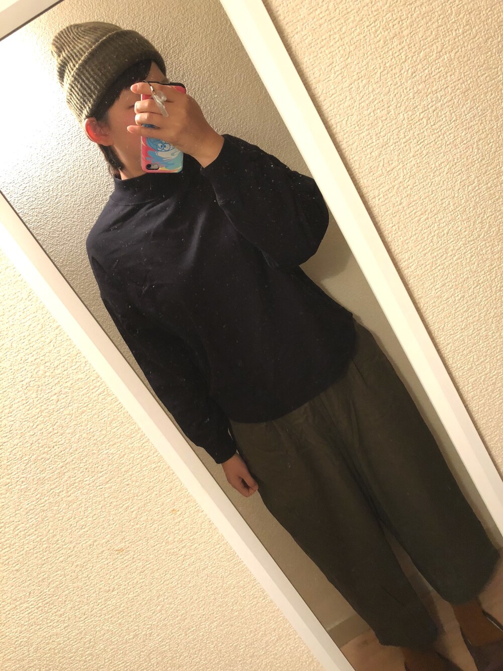 おはようございます。 カーキ×ブラックコーデ。 帽子もカーキがあったので揃えてみました。 八分丈のパンツから靴下を見せるのが可愛い。
