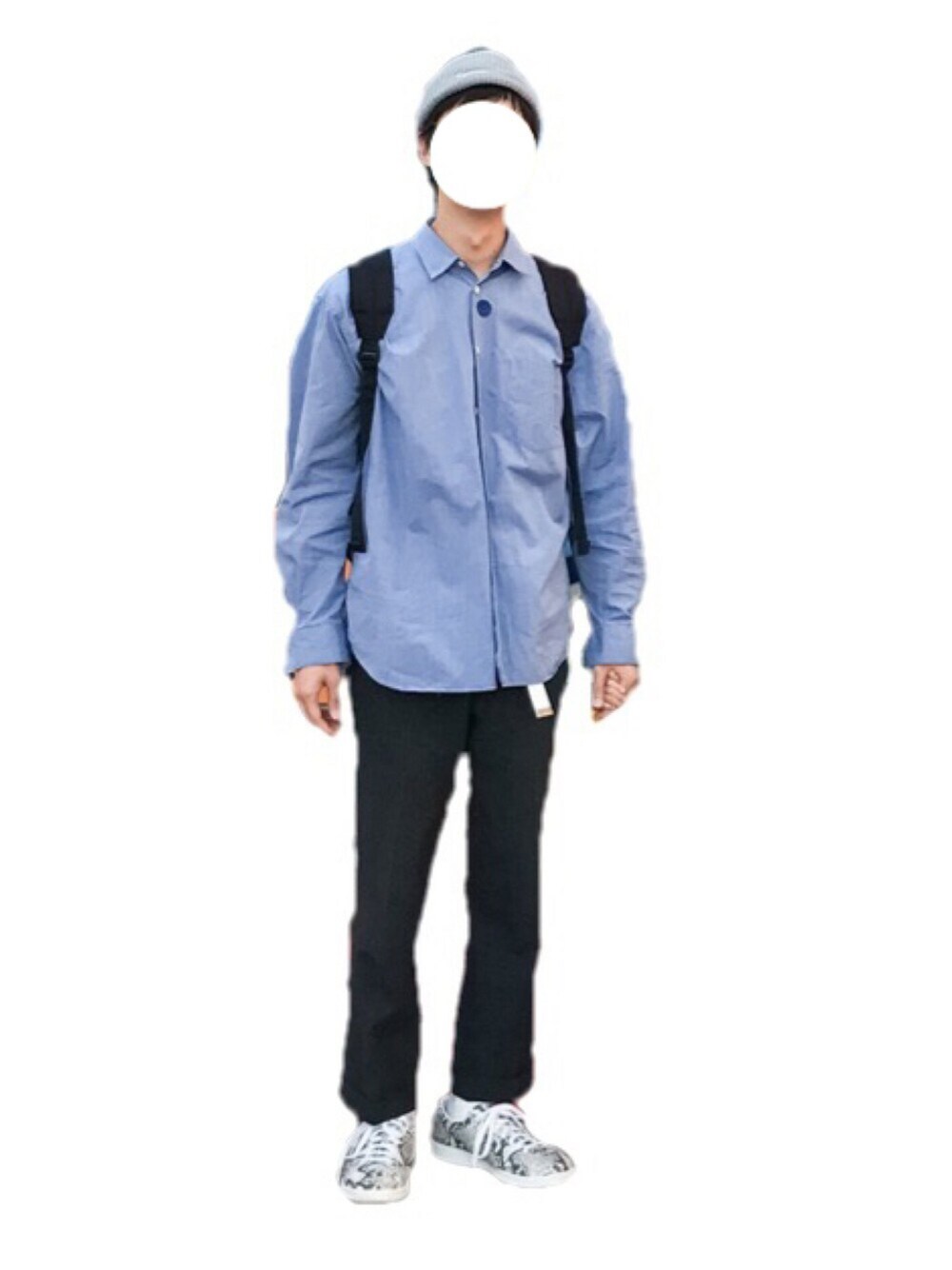 グレーとブルーはトレンド関係なく僕の常備色です オーバーサイズのギャルソンシャツのブラウスを綺麗に着ました 娘と手を繋いでいたので、手の中に指がいっぱいある心霊写真みたいになってます笑