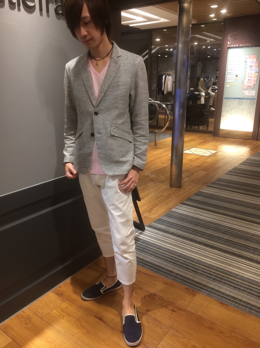 天王寺MIO ラトルトラップの山下です! いいね、セーブ、フォロー ありがとうございます☆ 今回は初夏に着たい爽やかコーデ☆ ジャケットは変形カラミ生地で 通気性抜群です!! 白パンは足首を見せる感じで スッキリさせてみましたd('∀'*)