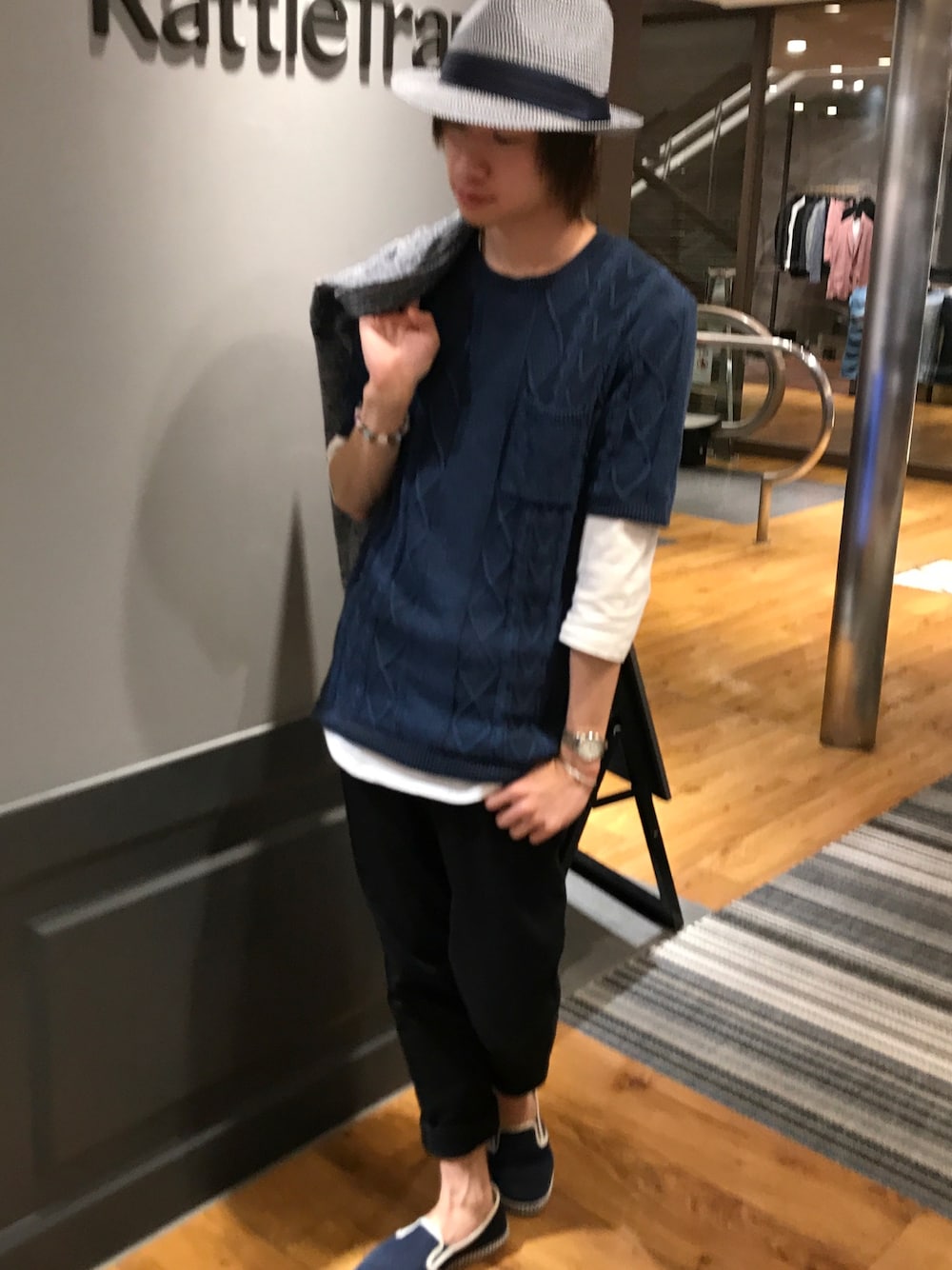 天王寺MIO ラトルトラップ山下です☆ いいね、セーブ、フォローありがとうございます☆ もう暑くなってきましたけど 今回のコーデは サマーニットです! 青のサマーニットに七分袖のロング丈Tシャツを合わせた ラフコーデです! グレーのジャケットを着たら 綺麗目なコーデにもなります!!