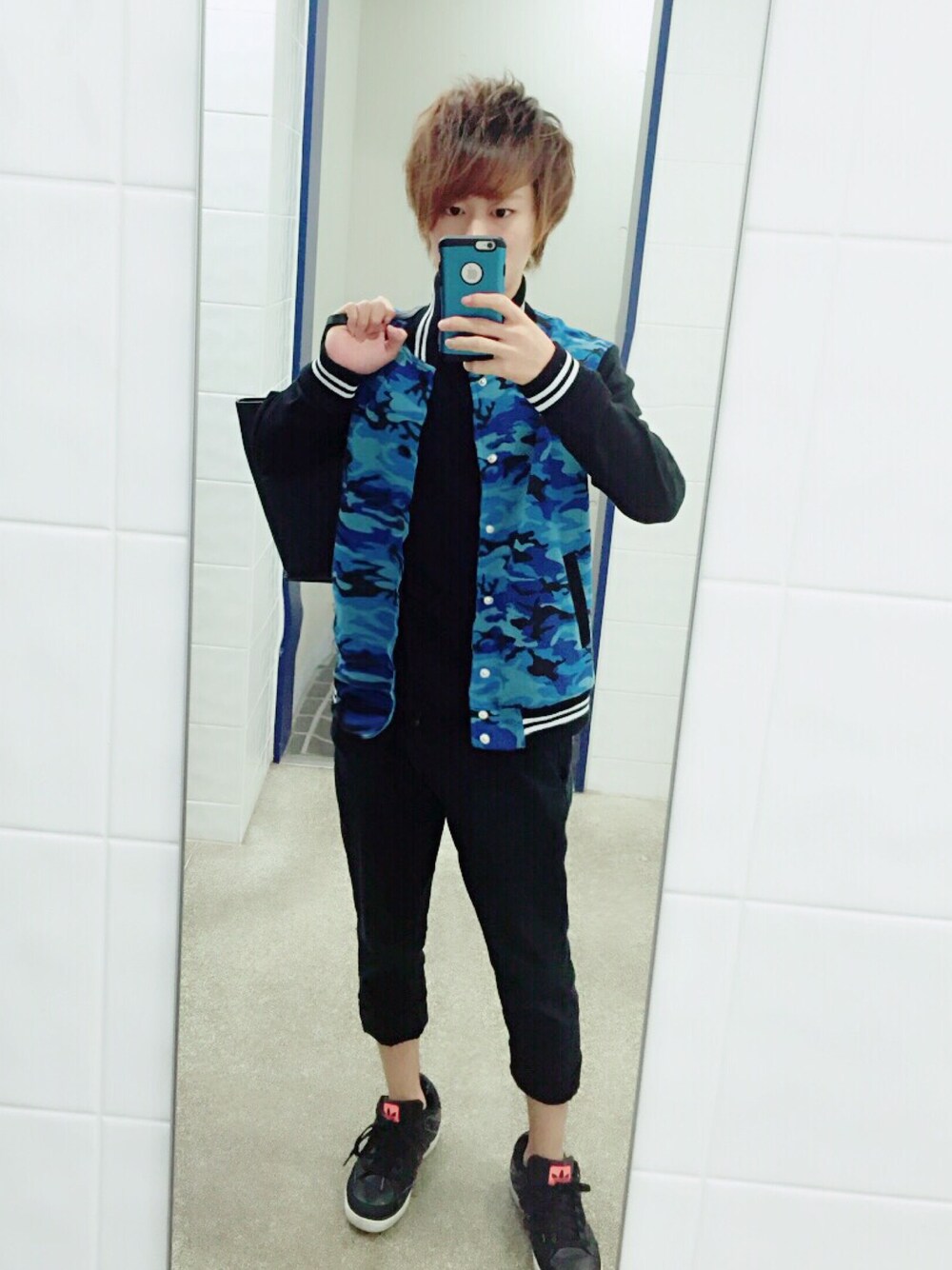 青のカモフラ柄のスタジャンです! これ結構目立つんだよね、、、笑 最近昼暑くても夜寒くなるから油断しないほうがいい👍笑