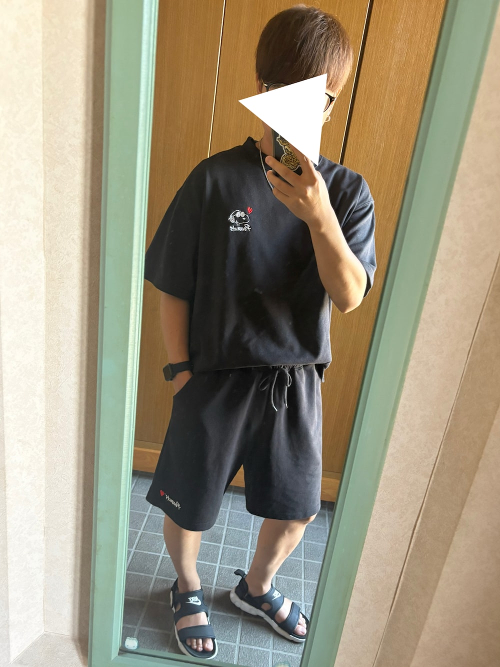 たくやのセットアップ「【PEANUTS / SNOOPY】別注 ピーナッツ スヌーピー セットアップ ワンポイントハート刺繍 オーバーサイズ 半袖プルオーバースウェット&ショートパンツ」を使ったコーディネート