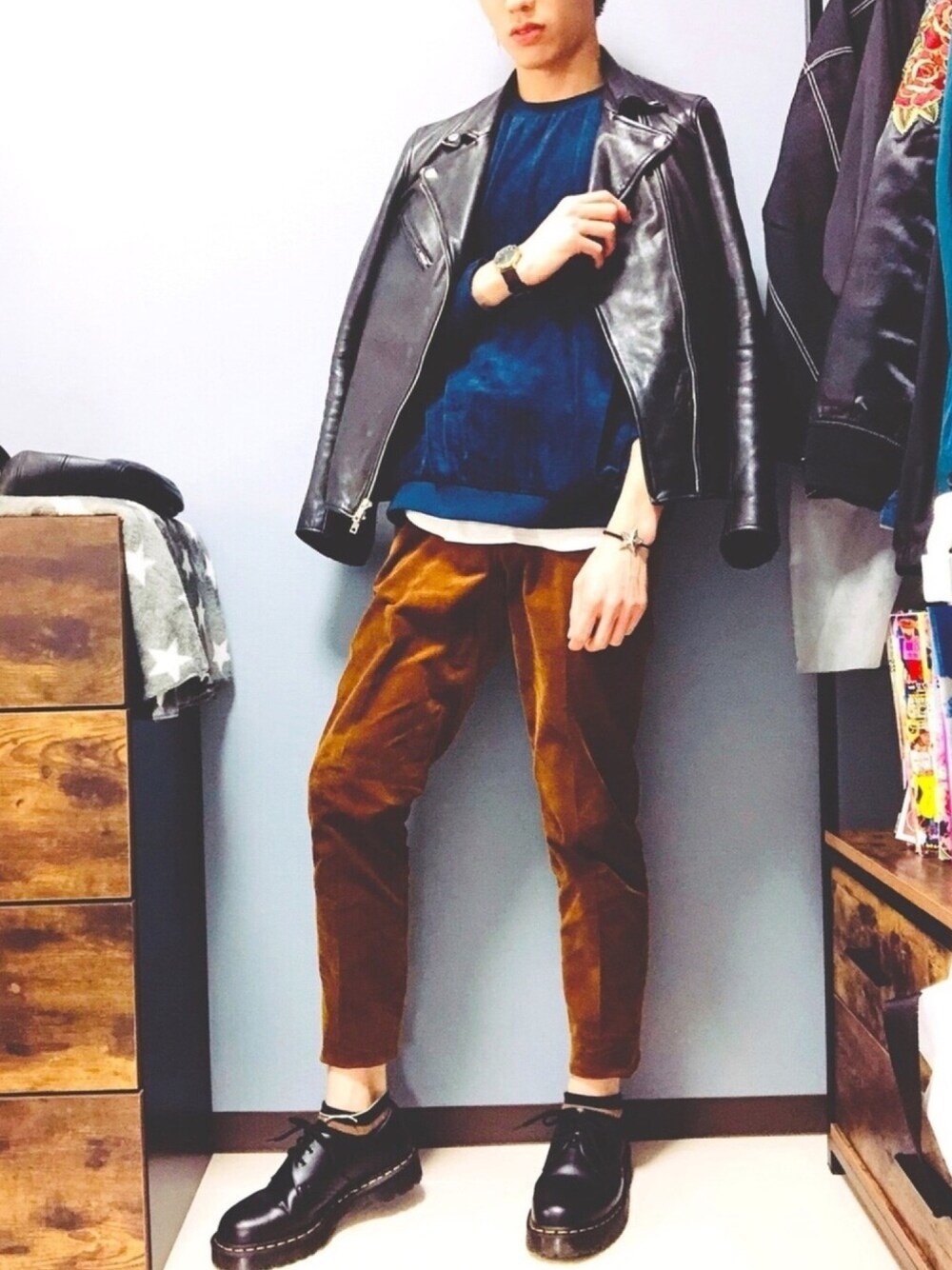 _n.takuya_fのライダースジャケット「ラムレザーダブルライダース」を使ったコーディネート