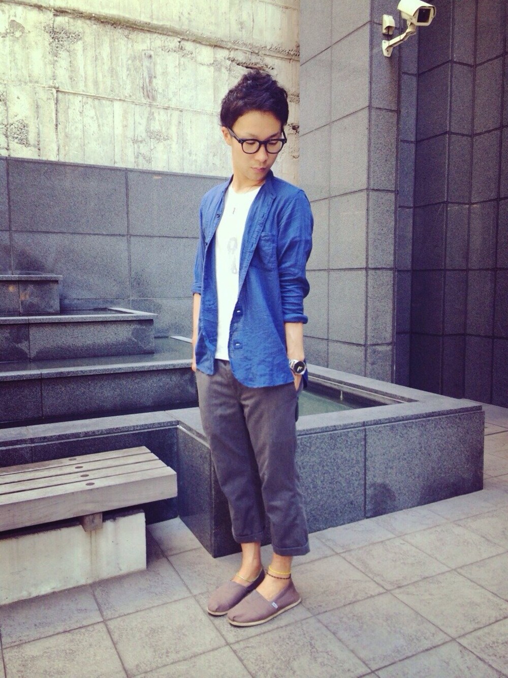 お久ぶりですー^o^ 暑いですねー、そんな中撮影しましたー。 ガーゼのシャツに黒縁メガネスタイルです(^^) 最近購入したガーゼのシャツ生地感がよく気に入っていますー。 ブランドはhave a good day です(^^)