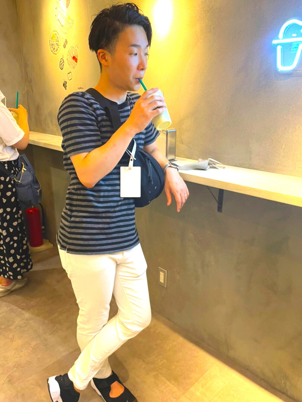 こんにちは 今日は久しぶりに難波に来ています^ - ^ メロンジュース🍈美味しい🥤 湿気が多く過ごしずらい日ですね コーディネートポイントはホワイトブラックグレーのモノトーンコーディネート シンプルで大人っぽいコーディネートです。