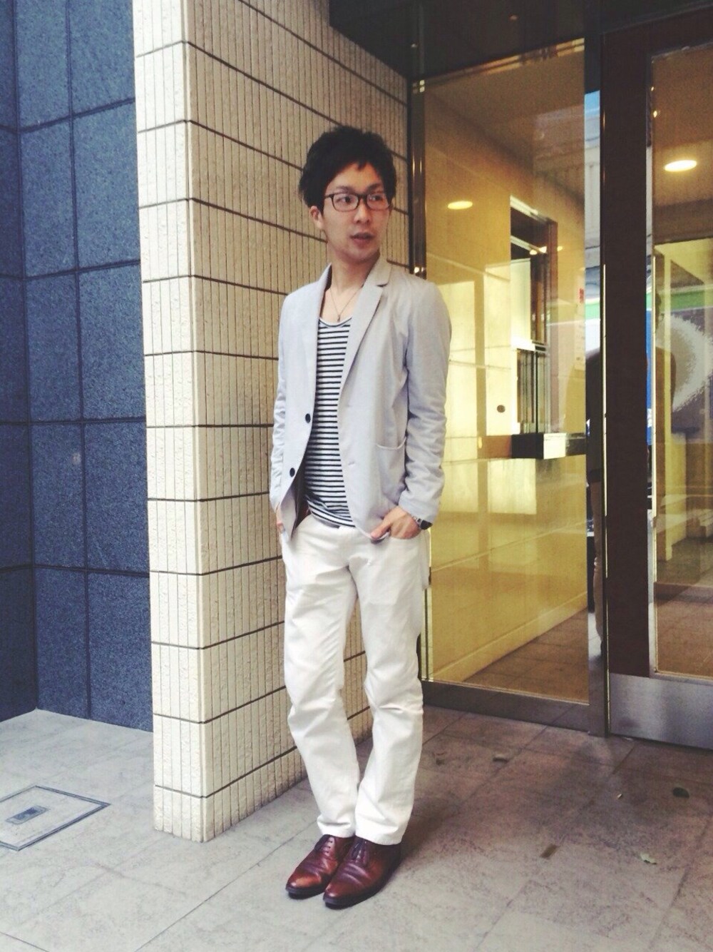 春真っ盛りですね(^ ^) 春らしくホワイトパンツを使用したコーディネートです^_^ ビジネスにも対応できるよう、薄手のジャケットにドレスシューズを組み合わせました(^ ^)