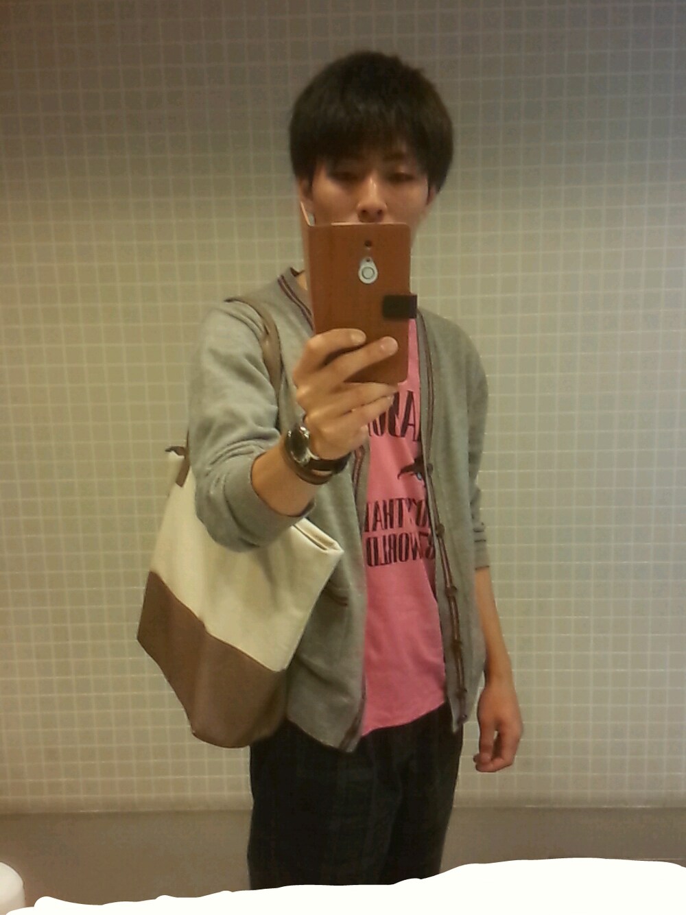 グレーカーディガン ピンクTシャツ ステテコ