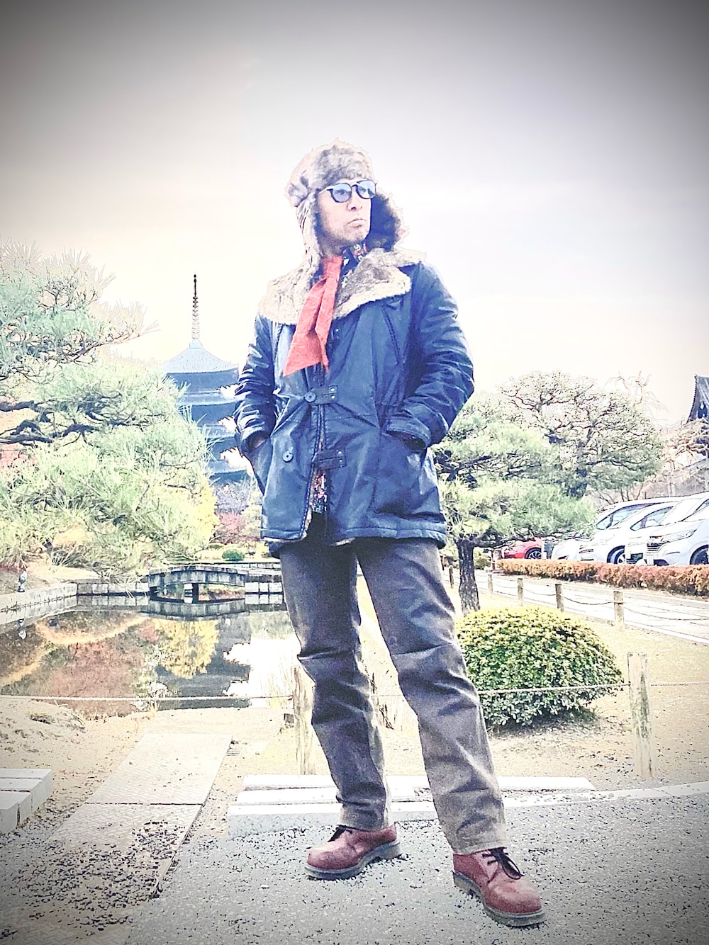 はい!皆さん、こんにちは! 先日の京都の世界遺産、東寺にてのイベント出店は、本年最終になりまして、沢山のお客様においで頂きました‼️ 誠に有難う御座います‼️😆 で、本日は、その出店前日の前準備のコーデ。京都は盆地故の所謂、底冷えが凄いんですよね😂故にヒートテックの極暖&通常ヒートテックの二枚重ね‼️ で、シャツ内部にアンソニータイ巻いてますが、コレ、コーデ云々ではなく、リアル防寒‼️の上から古着のリアルファーのコート‼️ 下は水牛の革パンツという、動物愛護団体からクレーム来そうな出立ちだが、両方とも大昔のアイテム故、ご容赦を😂 こんな寒い日には、やはりフライトキャップあったかい🥰耳の部分上げてみました。(写真三枚目) で、備品を買い出しに京都駅近くのモールへ。 デカいトナカイと撮ったらキャップ部分とファー部分がステルス的に。(写真四枚目) 写真5枚目は、これまたデカいシルバニアファミリーがいたので記念に。 真ん中の子🐰の写りがちょっと怖いぞ! で、東寺の近くに倉庫を借りているのだが、その倉庫までの道のりに、小窓の非常に気になりすぎるお店が。 おそらくガンダム制作会社の日本サンライズやバンダイ等が一切、感知しないであろうノンオフィシャル感が漂いまくっているお店だが、ジオン軍のエンブレムも力強く使用。 その名も、空海ゆかりの東寺の至近故の『慈恩弘国』である。 上部に書かれた〝創業 宇宙世紀007〟というのもナイス・オマージュ! 宇宙世紀と平安時代(空海の生きた時代)の時空を超えた奇跡のコラボレートに、お好み焼きを食べずしてお腹いっぱい!満腹である。 ちなみに、何度か前を通っているが、一度も開いているのを見た事がない。 開いてても、入るのに勇気が要りそうだが、入って、店主がギレンのコスプレで『あえて入れよう!天カスがあると!』とかくらい、言っててほしいね。 で、カウンターでグラサンかけた金髪が酒飲みながら『坊やだからさ』て言ってね。 1日店長にアムロ芸人の若井おさむさん呼んで『こいつ、焼けたぞ』とか『ボクが一番、上手く焼けるんだ。』とか言ってお好み焼いて貰ったりね。 やはり焼く前に『アムロ、焼きまーす!』って言って欲しい… …え?オマエ、以前の投稿もそうだけど、コーデとか、もうどうでもよくて、実はガンダムネタ言いたいだけちゃうんか?しつこいし、もうガンダムネタ、スベってるぞ、ですって? …スベりもせずに一人前になった奴が、どこにいるものか!(byブライト) ⭐︎最後までお目通し、誠に有難う御座います!また、沢山のリアクション、コメント、嬉し涙がちょちょぎれます😂