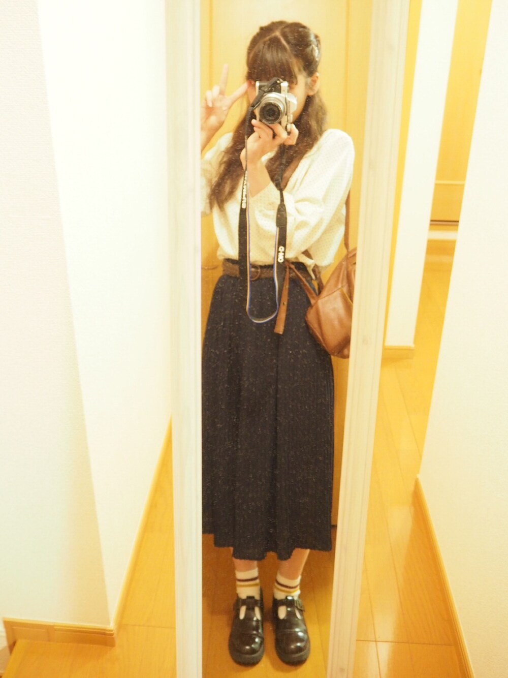 今日は黒のワンピースが 欲しくて色々探しに 行ってきました。 なかなが見つからず… いいの知ってる方ぜひ 教えてください👗 今日はお母さんのお下がり トップスとしまめるのスカーチョで 大人っぽく◡̈⃝︎⋆︎* 靴下に秋色いれました🍄 ヘアアレンジはハーフアップで 2つに分けてくるりんぱして それをまとめてくるりんぱしてます🌀 そしてラブ&ピース✌︎