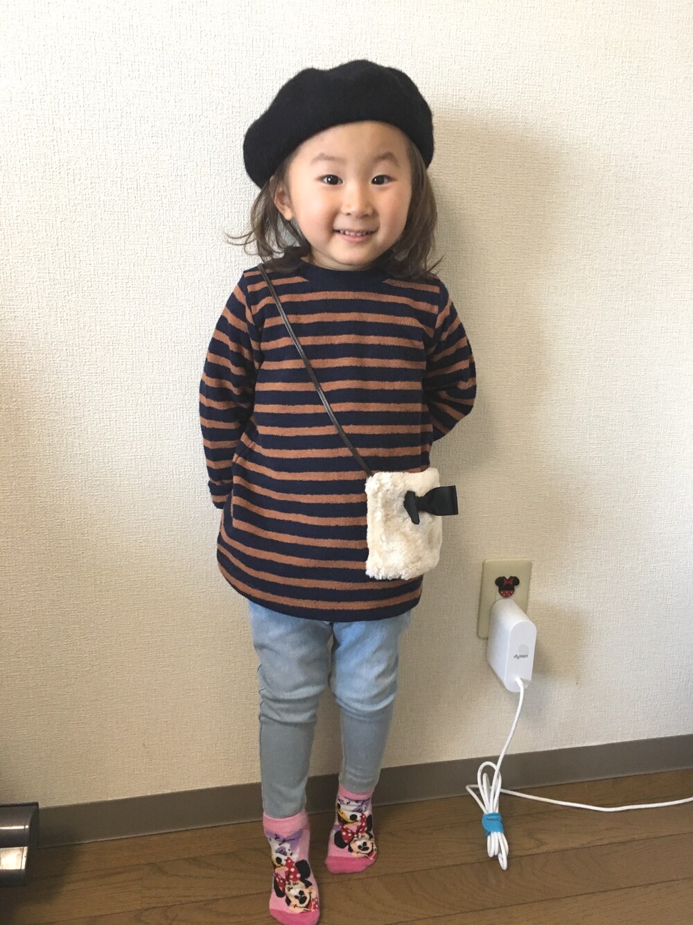 お散歩コーデ🚶♀️ ボーダーポシェットのトップスがお気に入り❤️ポシェット部分にモノを入れられるのでガチャガチャのオモチャを忍ばせてます(笑) トップスは100 ボトムスは90