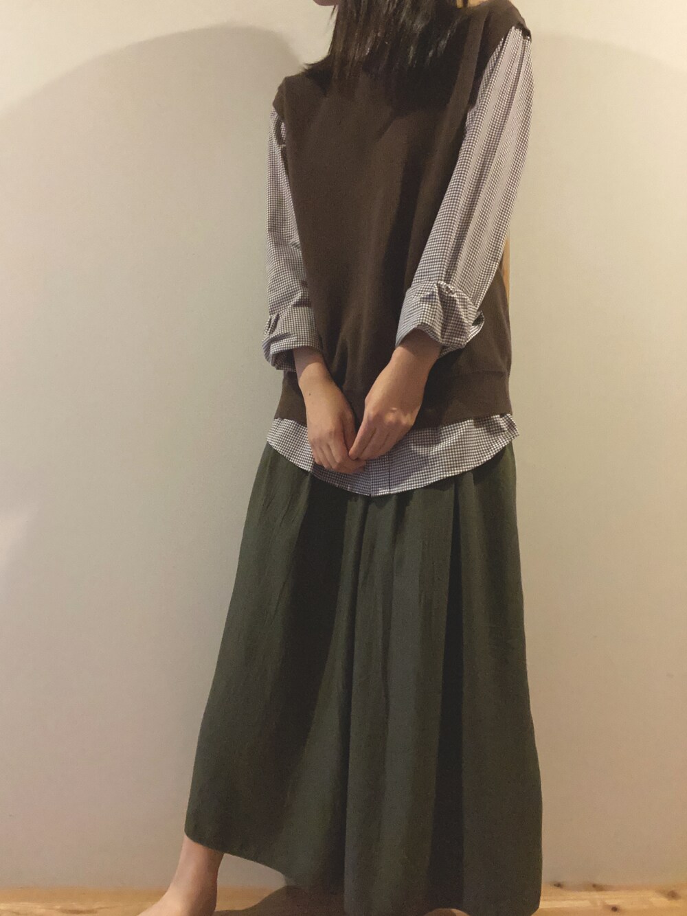 全身ユニクロ秋コーデ!🍁🍂✨ メンズのチェックシャツ、オーバーサイズニットベストにギャザースカートパンツを合わせました! ニットベスト本当に可愛い!🤍オススメです
