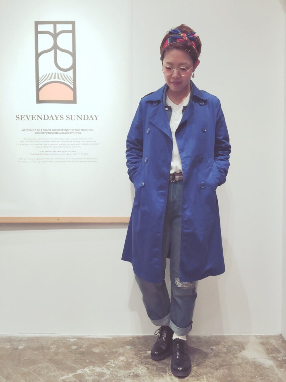 スカーフ頭に巻きました! 白Tにデニムでシンプルスタイル👚💕 ブルーのトレンチは相変わらずのお気に入り。