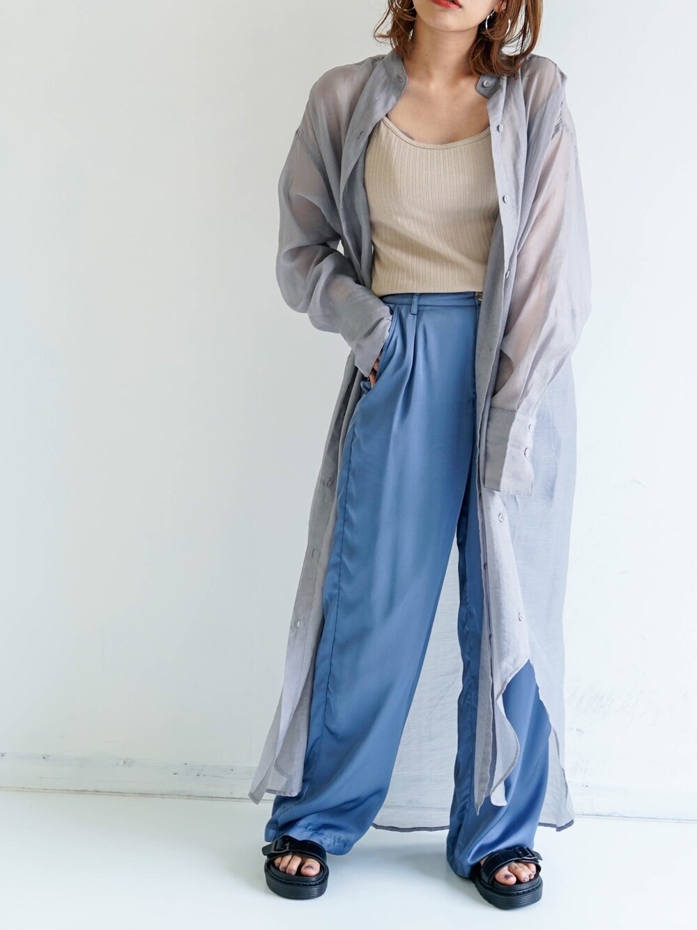 ブルーグレーコーデ☺︎ 色味に統一感を持たせて ブルーのパンツでポイントを入れつつ馴染むように意識しました◎ アントマリーズ のシアーシャツワンピ 絶妙な透け感がトレンド感抑えててかわいい💕