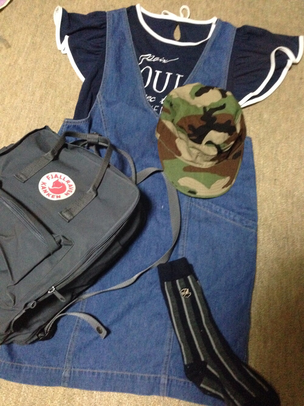 トップス:マジェスティックレゴン ワンピース:w closet リュック:カンケン 帽子:古着 靴下:フジヤ タイムセールで安かったんで買ってしまったデニムワンピース… 里奈ちゃんコラボと合わせたらやっぱり可愛い( `・ω・´)