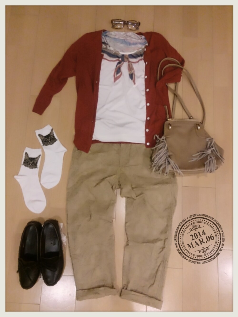 スカーフプリントTシャツってことで…。 ネコの靴下が可愛くて白、黒、どちらにするか決められなくて両方買い(笑) 3足¥1000だからいいかな~♪ メガネUNIQLO パンツrighton TシャツGU カーディガンtricottricot 靴 ミネトンカ