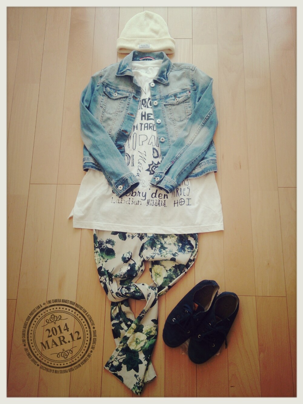 花柄とツルツルの履き心地に惚れて色違い買いしたお気に入りの柄パンです♪ GジャンGU Tシャツrosebud パンツhuitiemenid ニット帽righton